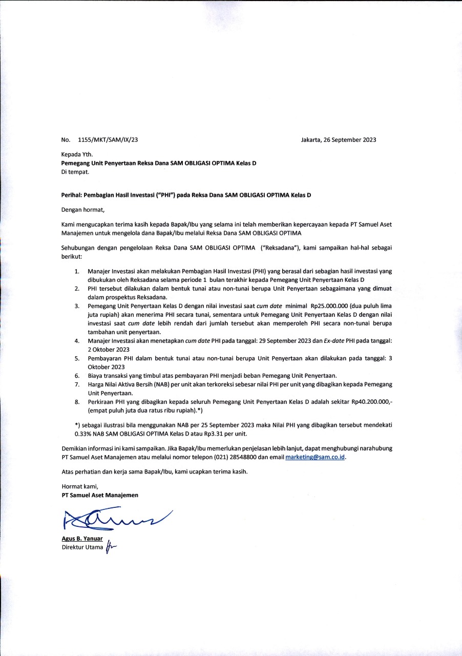 *) sebagai ilustrasi bila menggunakan NAB per 25 September 2023 maka Nilai PHI yang dibagikan tersebut mendekati 0.33% NAB SAM OBLIGASI OPTIMA Kelas D atau Rp3.31 per unit.