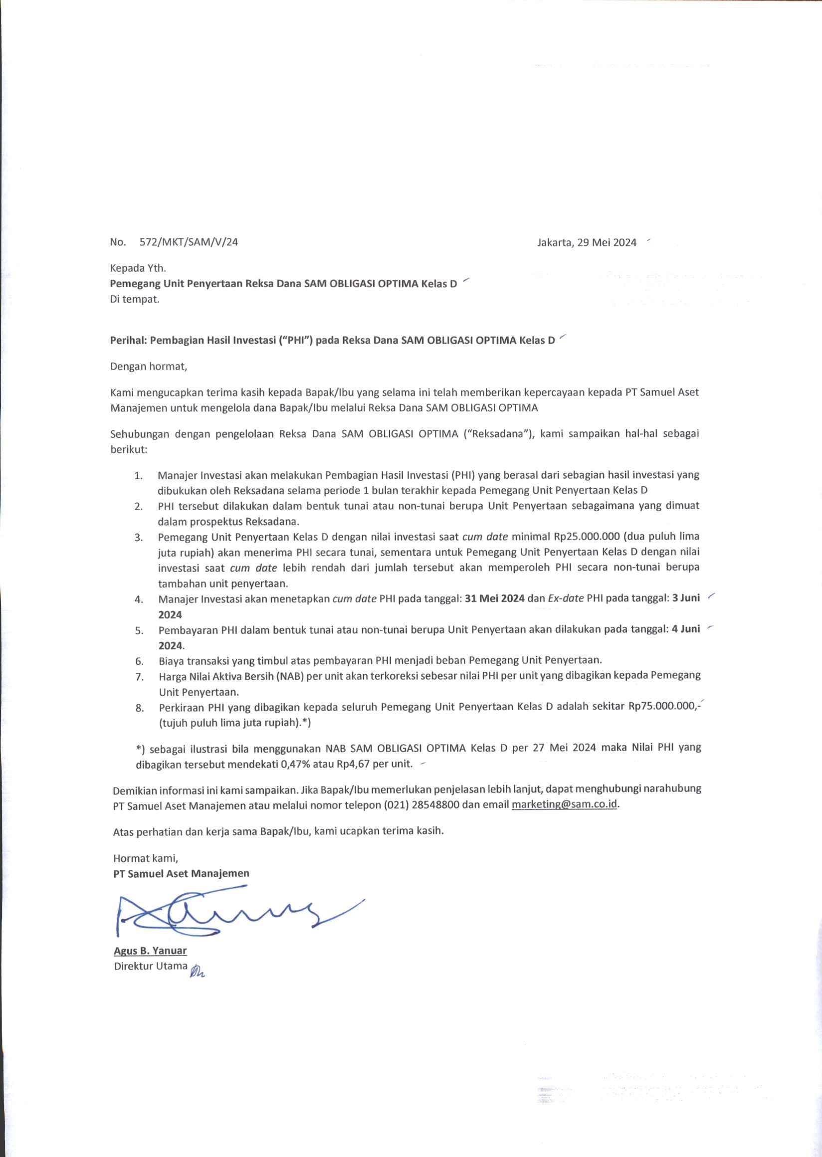 *) sebagai ilustrasi bila menggunakan NAB SAM OBLIGASI OPTIMA Kelas D per 27 Mei 2024 maka Nilai PHI yang dibagikan tersebut mendekati 0,47% atau Rp4,67 per unit.