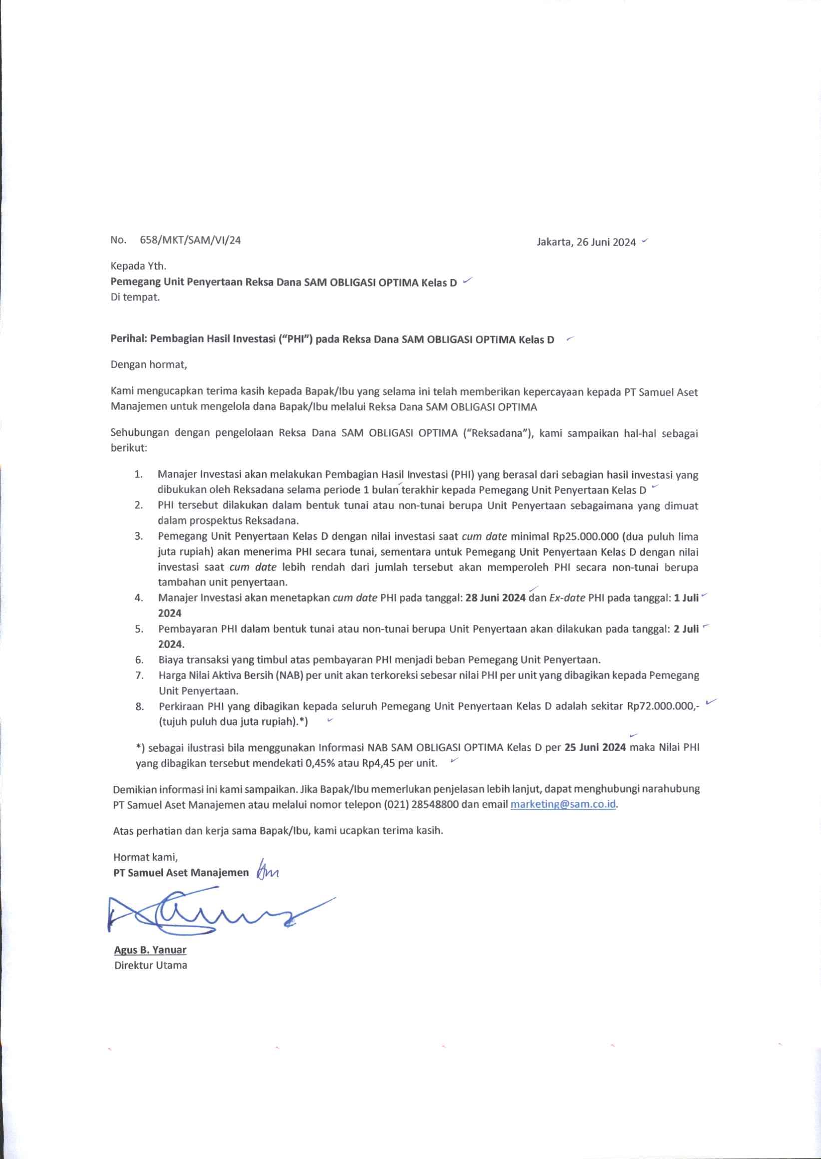 Demikian informasi ini kami sampaikan. Jika Bapak/Ibu memerlukan penjelasan lebih lanjut, dapat menghubungi narahubung PT Samuel Aset Manajemen atau melalui nomor telepon (021) 28548800 dan email [email protected].