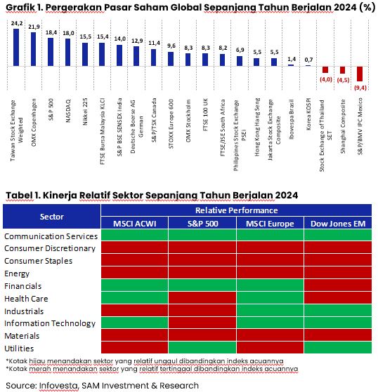Dari sisi kinerja sektoral saham pada kawasan-kawasan ekonomi besar di dunia, sektor Teknologi, Keuangan, dan Telekomunikasi cenderung memimpin sejak awal tahun. Sementara sektor Bahan Baku, Barang Konsumen Non-Primer, dan Energi relatif tertinggal.
