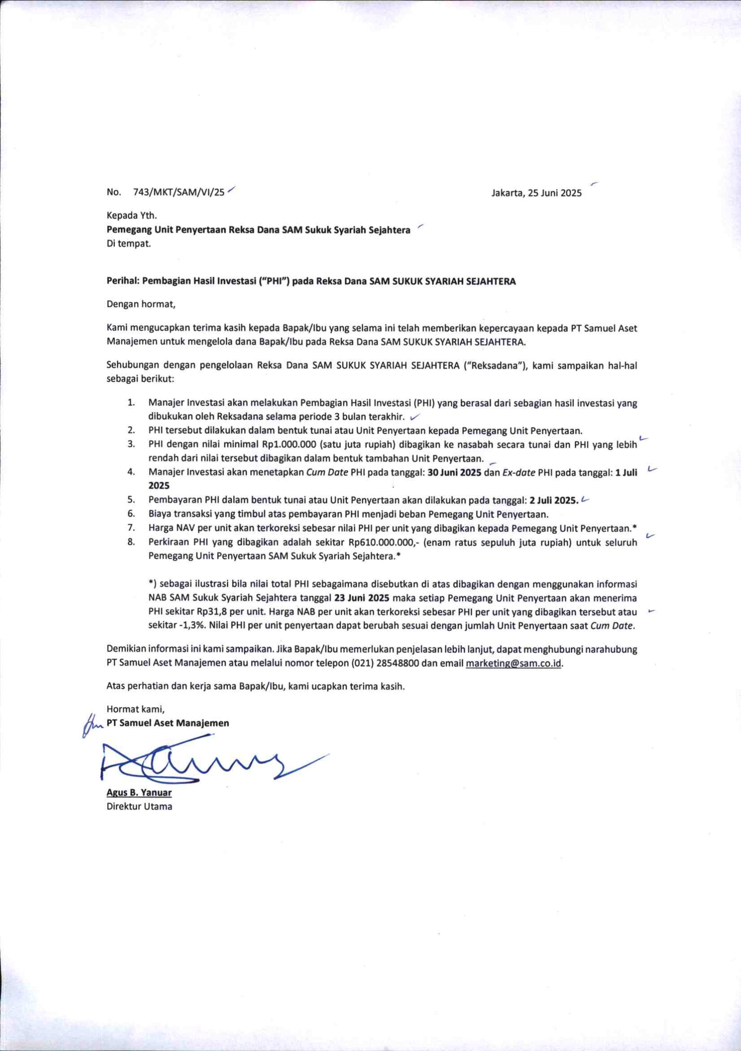 *) sebagai ilustrasi bila nilai total PHI sebagaimana disebutkan di atas dibagikan dengan menggunakan informasi NAB SAM Sukuk Syariah Sejahtera tanggal 23 Juni 2025 maka setiap Pemegang Unit Penyertaan akan menerima PHI sekitar Rp31,8 per unit. Harga NAB per unit akan terkoreksi sebesar PHI per unit yang dibagikan tersebut atau sekitar -1,3%. Nilai PHI per unit penyertaan dapat berubah sesuai dengan jumlah Unit Penyertaan saat Cum Date.