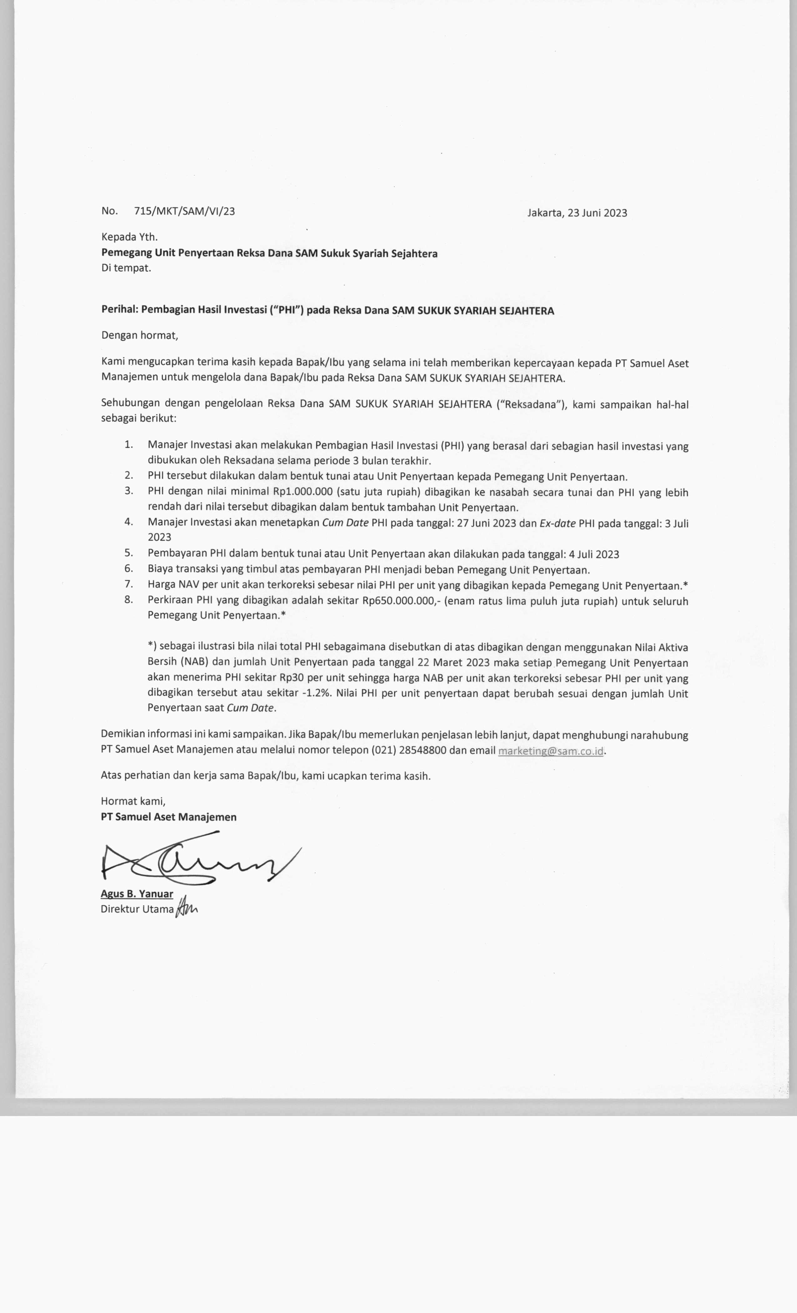 Selengkapnya dapat membaca surat terlampir atau jika membutuhkan penjelasan lebih lanjut dapat menghubungi narahubung PT Samuel Aset Manajemen di nomor WA 02128548800 atau email ke [email protected].