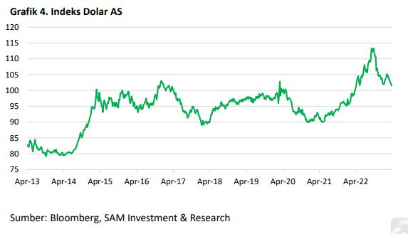 Mengacu pada indeks volatilitas, saat ini pasar berada dalam tingkat volatilitas yang lebih tinggi dibandingkan kondisi normal. Indikator pasar lainnya yang penting untuk dicermati adalah indeks Dolar AS. Pelemahan indeks Dolar AS biasanya memberikan sentimen yang positif untuk pasar negara berkembang.