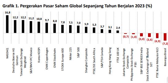 Pasar saham global mengalami penguatan sejak awal tahun. Rerata indeks saham global, yang merupakan gabungan dari indeks saham negara maju dan negara berkembang, mencatatkan kenaikan sebesar 5%. Terutama digerakan oleh reboundnya indeks saham Teknologi di Amerika Serikat (NASDAQ)