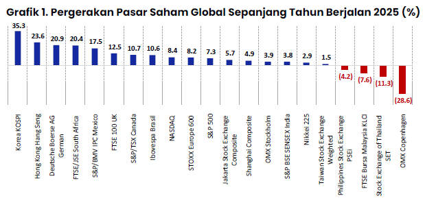 Pasar saham global mengalami penguatan sejak awal tahun. Rerata indeks saham global, yang terdiri dari indeks saham negara maju dan negara berkembang, mencatatkan kenaikan sebesar 7%. Indeks saham Korea Selatan (KOSPI) tercatat sebagai pemimpin indeks saham global, sementara indeks saham Denmark (OMX Copenhagen) menjadi yang paling tertinggal.