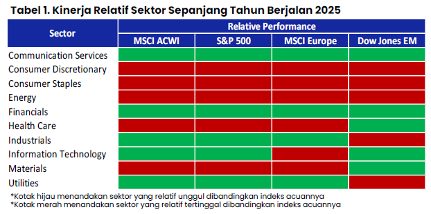 Dari sisi kinerja sektoral saham pada kawasan-kawasan ekonomi besar di dunia, sektor Keuangan, Perindustrian, dan Telekomunikasi cenderung memimpin sejak awal tahun. Sementara sektor Barang Konsumen Non-Primer, Kesehatan, dan Barang Konsumen Primer relatif tertinggal.