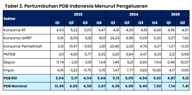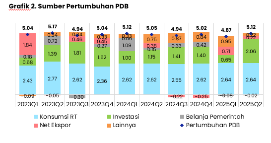 Pada Triwulan II-2025 ekonomi Indonesia tumbuh 5,12% secara tahunan, tertinggi dalam enam triwulan terakhir. Konsumsi Rumah Tangga (RT) tumbuh sedikit lebih baik dibandingkan triwulan sebelumnya dari 4,95% menjadi 4,97%. Investasi (PMTDB) tumbuh 6,99%, tertinggi sejak 2021. Adapun Konsumsi Pemerintah masih terkontraksi seiring dengan efisiensi anggaran sejak awal tahun.