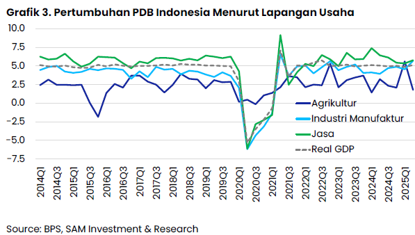 Menurut lapangan usaha, sektor agrikultur tumbuh 1,79% secara tahunan di Triwulan II-2025, melambat dibandingkan triwulan sebelumnya sebesar 5,62%. Sektor industri manufaktur tumbuh 5,68%, tertinggi sejak 2021. Sektor jasa mengalami kenaikan pertumbuhan dari 5,35% di Triwulan I-2025 menjadi 5,77% di Triwulan II-2025.