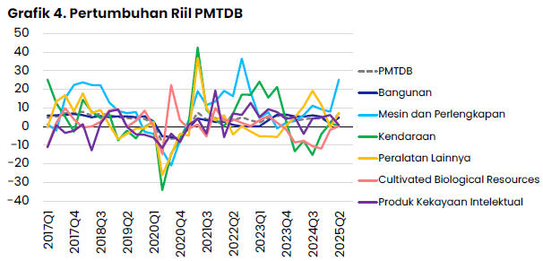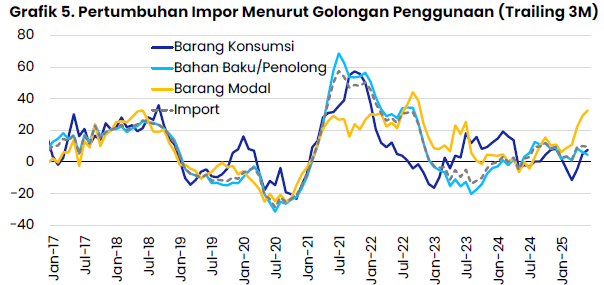Tingginya pertumbuhan sektor Mesin dan Perlengkapan di Triwulan II-2025 sejalan dengan tingginya impor barang modal dimana sepanjang Triwulan II-2025 tumbuh sebesar 32,5% secara tahunan. Adapun impor barang konsumsi dan bahan baku/penolong tumbuh jauh lebih rendah masing-masing sebesar 7,6% dan 4,5% secara tahunan.
