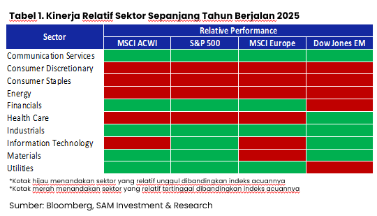 Dari sisi kinerja sektoral saham pada kawasan-kawasan ekonomi besar di dunia, sektor Keuangan, Perindustrian, dan Telekomunikasi cenderung memimpin sejak awal tahun. Sementara sektor Barang Konsumen Non-Primer, Kesehatan, dan Barang Konsumen Primer relatif tertinggal.