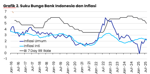 RDG Bank Indonesia bulan Agustus memutuskan untuk kembali memotong BI 7 Day RR Rate sebesar 25 basis poin menjadi 5%. Dengan demikian sepanjang tahun 2025 BI telah memotong suku bunga acuannya sebesar 100 basis poin. Pemotongan suku bunga sejalan dengan Inflasi yang masih dalam target BI di 2,5±1%. Inflasi inti bahkan dalam tren menurun selama 5 bulan terakhir.