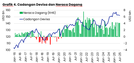 Cadangan Devisa di Bulan Juli tercatat sebesar US$151,99 miliar, turun sedikit dibandingkan bulan sebelumnya sebesar US$152,57 miliar. Cadangan devisa dalam tren meningkat selama 3 tahun terakhir seiring neraca dagang yang terus mencatatkan surplus.