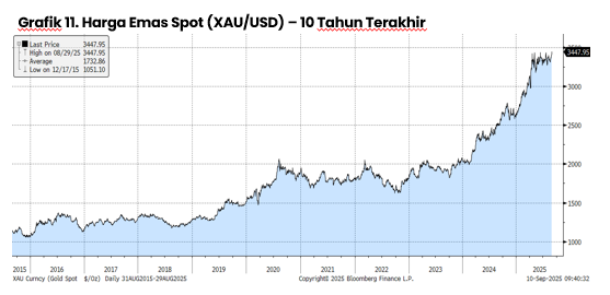 Beriringan dengan itu, harga emas spot dalam dolar AS (XAU/USD) terus bergerak di level tinggi hingga akhir Agustus 2025, didorong kombinasi pelemahan indeks dolar dan ekspektasi penurunan suku bunga Federal Reserve. Imbal hasil obligasi AS yang cenderung turun membuat biaya peluang memegang emas semakin rendah, sehingga menarik aliran modal baru ke aset ini.