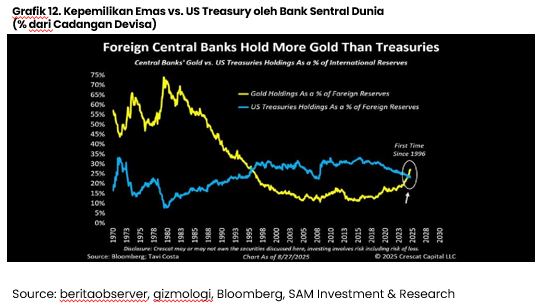 Grafik 12 menunjukkan minat bank sentral dunia dalam mengakumulasi emas sebagai aset cadangan (reserves asset). Kepemilikan emas bank sentral seluruh dunia telah mencapai level tertinggi sejak 1996 dan melampaui persentase kepemilikan mereka pada surat berharga negara Amerika Serikat, menunjukkan peran emas yang semakin penting dalam pengelolaan kebijakan moneter negara-negara di dunia.