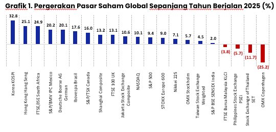 Pasar saham global mengalami penguatan sejak awal tahun. Rerata indeks saham global, yang terdiri dari indeks saham negara maju dan negara berkembang, mencatatkan kenaikan sebesar 9%. Indeks saham Korea (KOSPI) tercatat sebagai pemimpin indeks saham global, sementara indeks saham Denmark (OMX Copenhagen) menjadi yang paling tertinggal.